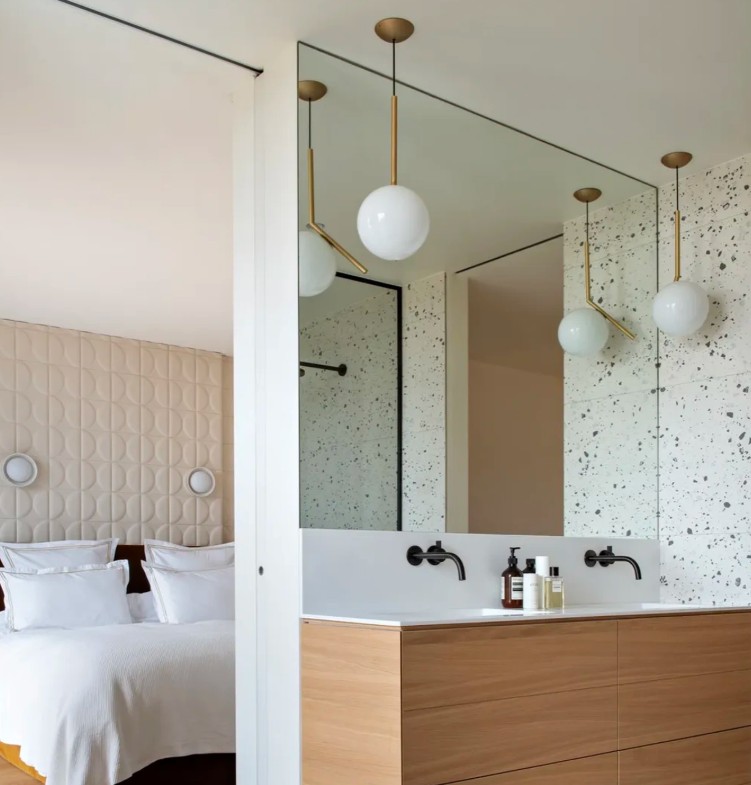 Hiệu ứng thị giác mà nó mang lại thật sự đáng kinh ngạc. Không gian như được nhân đôi, tạo cảm giác rộng rãi, thoáng đãng và sang trọng như ở một spa cao cấp. “Giải pháp tối giản này biến gương thành phông nền liền lạc, nhân đôi ánh sáng tự nhiên lẫn nhân tạo, giúp phòng tắm sáng bừng và rộng mở hơn”, Caroline Milns phân tích. Lựa chọn này táo bạo nhưng cực kỳ hiệu quả, mang lại vẻ đẹp hiện đại, tinh gọn và vượt thời gian.