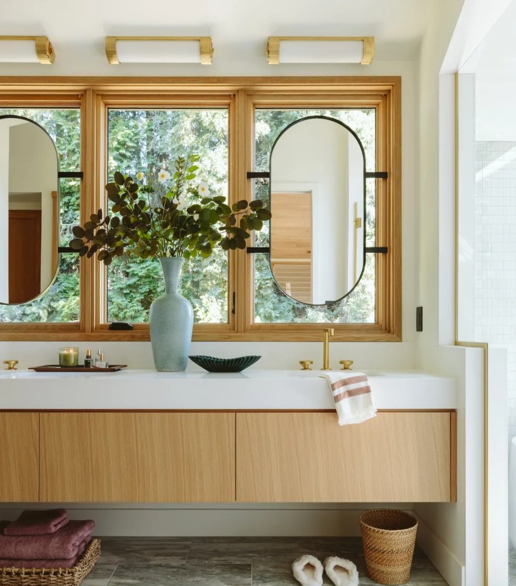 Nhà thiết kế Emily Henderson chia sẻ: “Đây là xu hướng gương phòng tắm tôi yêu thích nhất. Ánh sáng ban ngày không chỉ giúp việc soi gương chuẩn xác hơn, mà còn mang lại hiệu ứng thị giác vô cùng ấn tượng”.